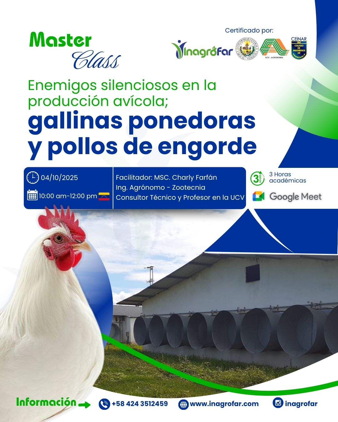 ¿Sabes cuáles son los factores que, sin darte cuenta, están afectando la rentabilidad de tu granja? Nuestra master class en línea te ayudará a identificarlos. Aprende a manejar la producción de pollos de engorde y gallinas ponedoras de manera más eficiente, analizando los enemigos silenciosos que alteran la ganancia de peso, la conversión de alimento y la calidad del huevo.